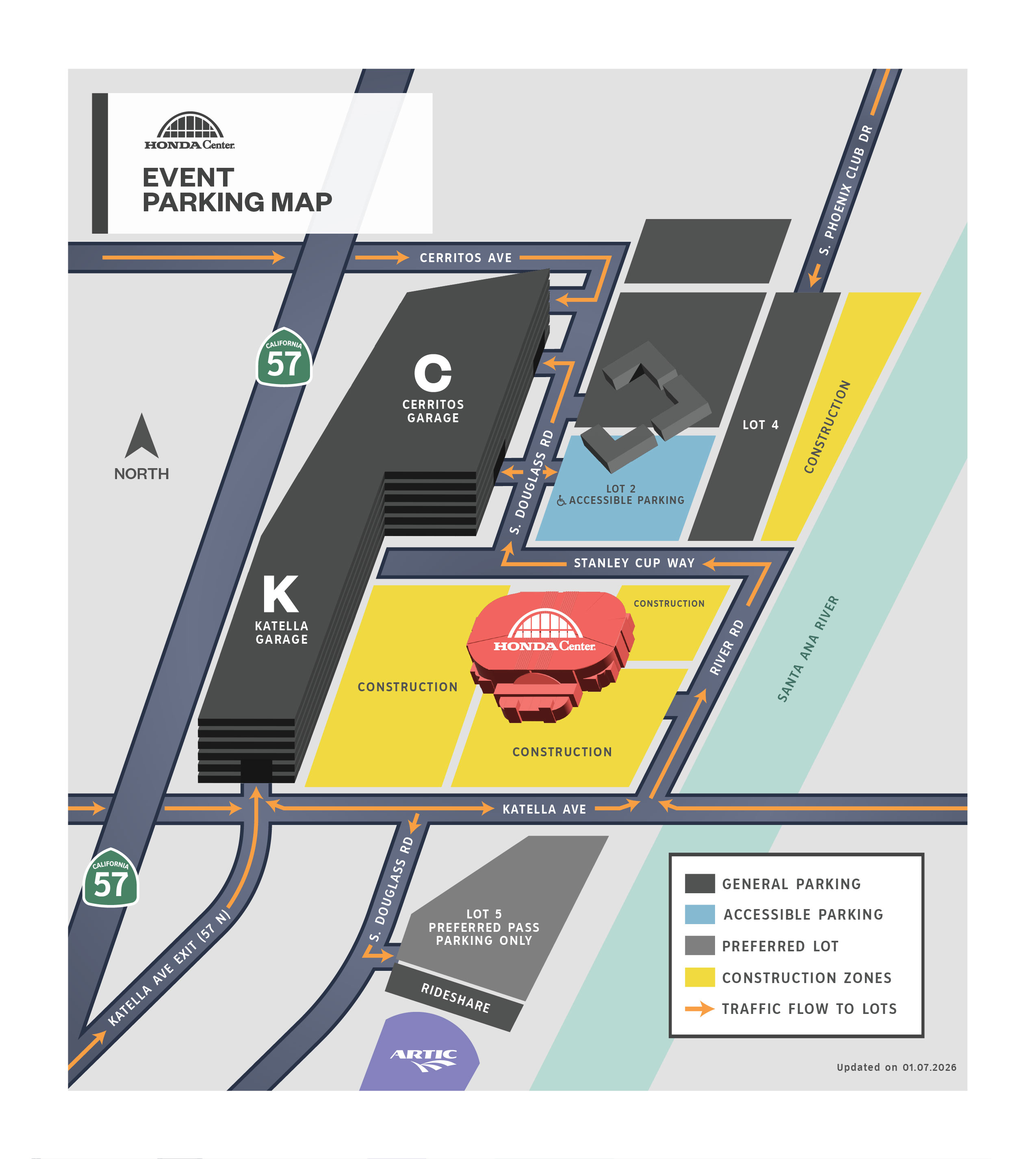 General parking at onsite lots and garages, including the newly available Katella Garage and Cerritos Garage, is included with event tickets listed on the Honda Center events page. There is no separate parking pass.