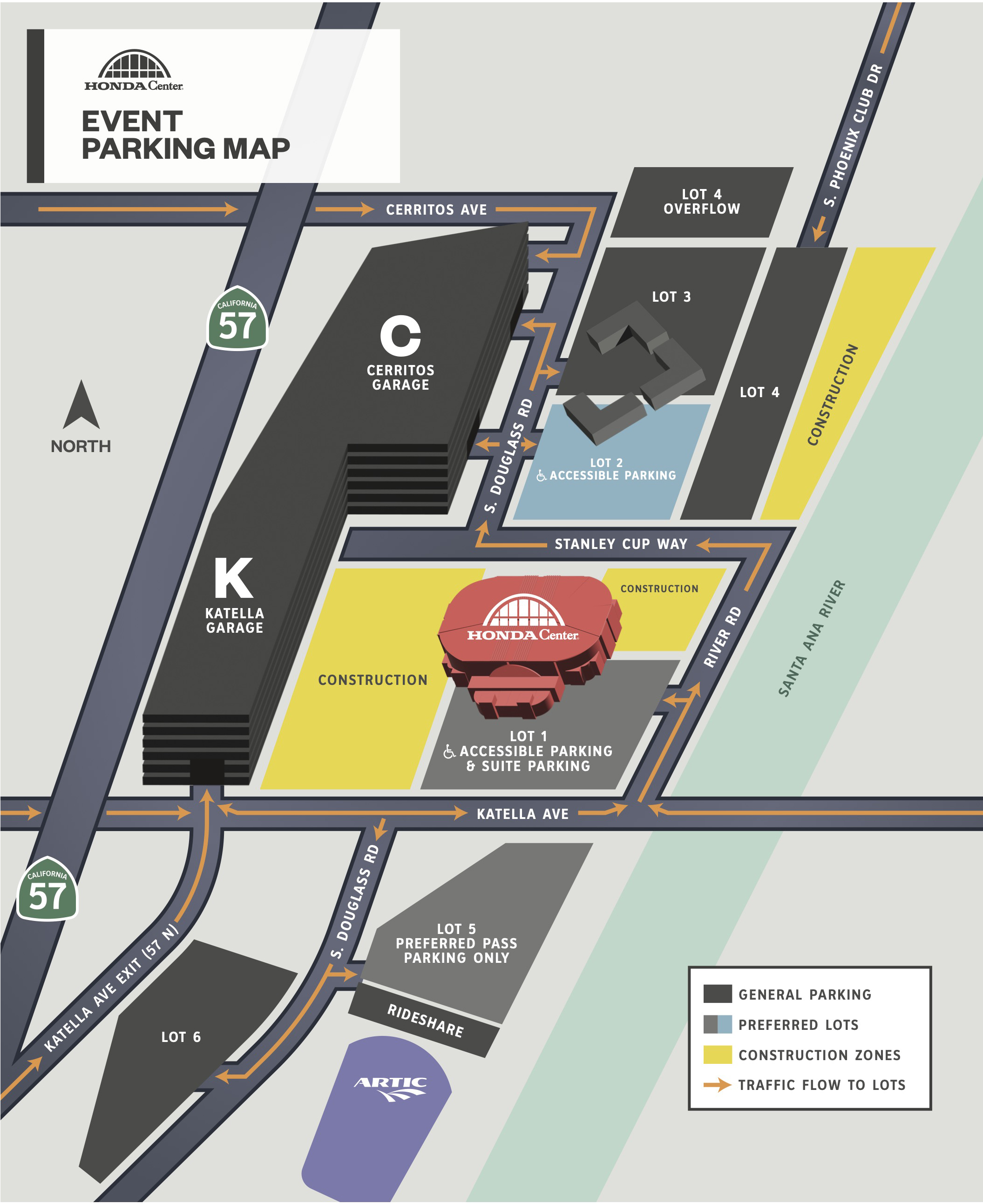 Onsite parking is limited due to ongoing construction and improvements. Accessible stalls are located in Honda Center parking lots as shown on the map below. Designated accessible parking is available for vehicles displaying a current disability plate or placard issued by all 50 States, the District of Columbia, and all Canadian Provinces. Accessible parking is on a first-come, first-parked basis. Just as with all of our general parking spaces, particular accessible spaces cannot be reserved in advance. Once accessible parking spaces are fully occupied, guests will be directed to the closest available general parking area.
