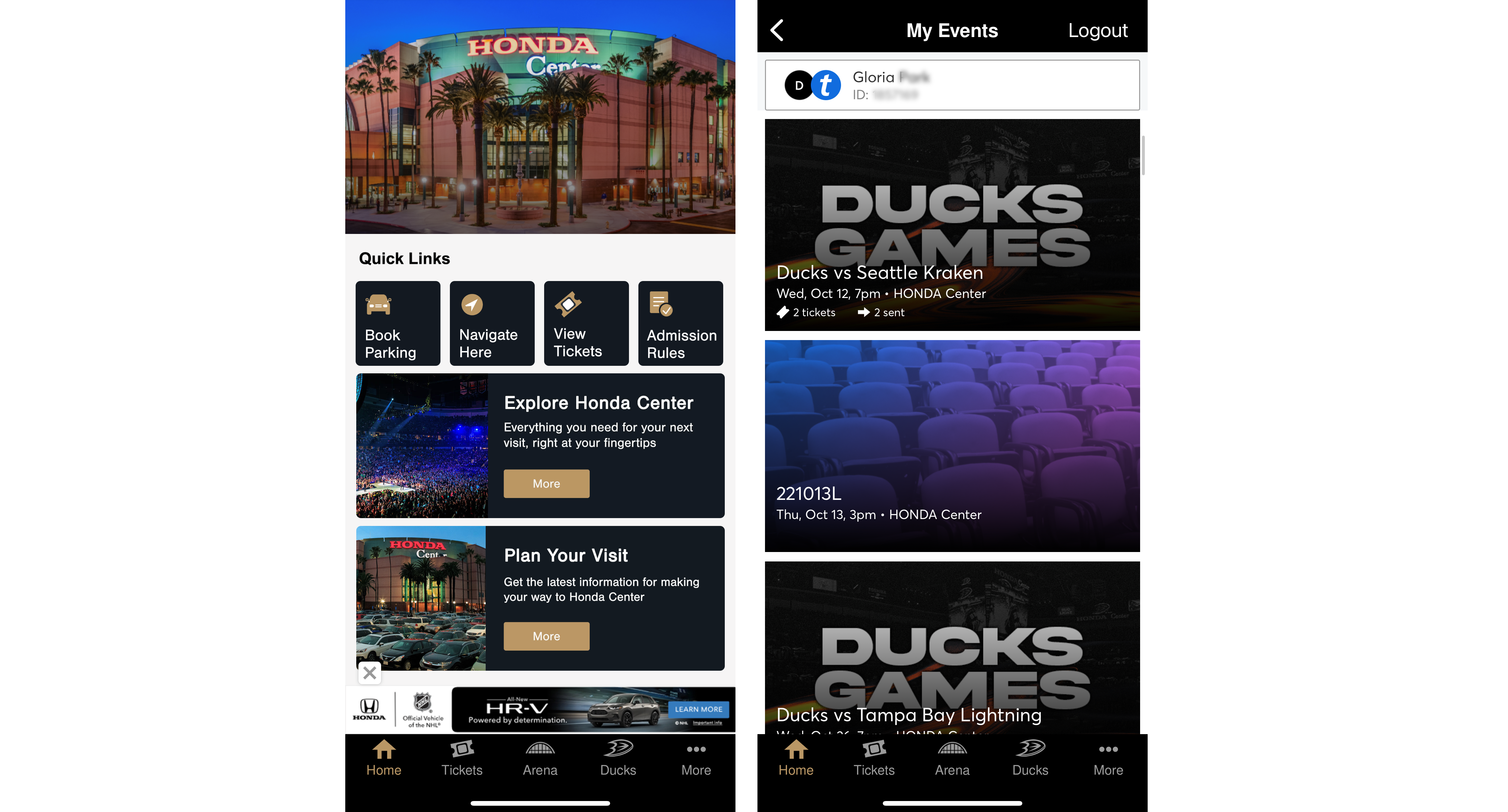 - From the Honda Center App home screen, tap on the "Tickets" bottom menu icon and then tap on "View My Tickets." Then tap on the “View” button under “Manage Tickets” on the top of the page.